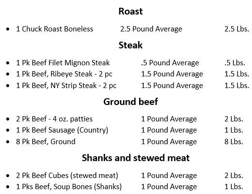 PS: Occasionally we may need to swap out a steak or the roast with something of similar cut and value depending on availability.